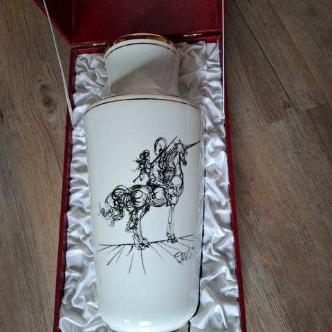 Vi er stolte av å presentere et sett med seks fliser produsert av det spanske firmaet Mikana i 1964, basert på de originale designene laget av den surrealistiske mesteren Salvador Dalí i 1953-54 i Valencia. Flisene representerer tre grunnleggende temapar: Liv og død, krig og fred, kjærlighet og musikk. Hvert tema er kunstnerisk tolket av Dalí, som har klart å gi disse universelle menneskelige erfaringene et unikt visuelt uttrykk. Hver flis bærer Dalís signatur og er en sjelden skatt for kunstelskere. For å gjøre dem enda mer spesielle, har vi rammet inn hver flis i denne samlingen, slik at de er klare til å henges opp på veggen. Dette gjør dem til en fantastisk dekorasjon for ethvert hjem eller galleri!