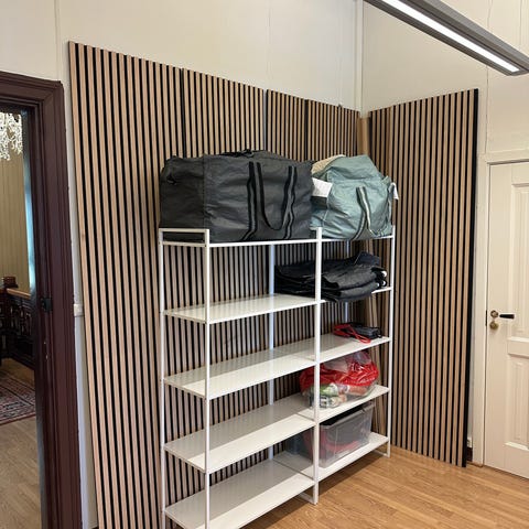 Spileplater Valnøtt. Bakplate i sort akustikkfilt. Spiler i MDF overfinert med Valnøtt.