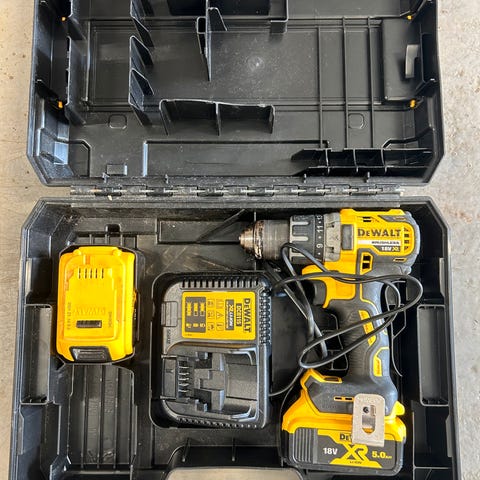 Tilbud på drill med 2 batteri, borsett og hullsagsett