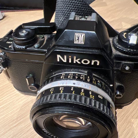 Analogt Nikon EM kamera med original 50mm f/1.8-linse, etui og reim selges. Fungerer som det skal.