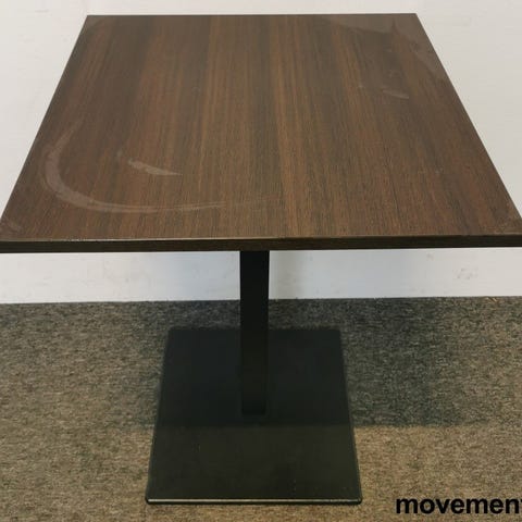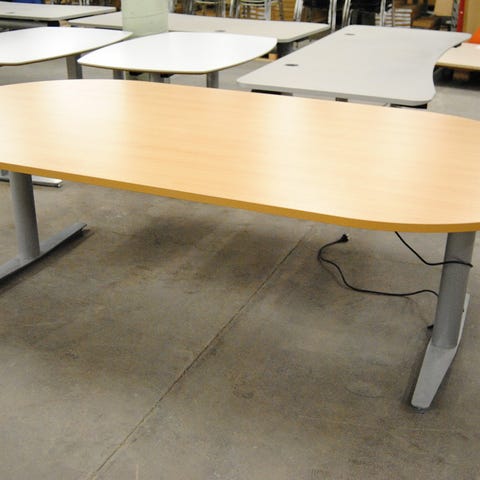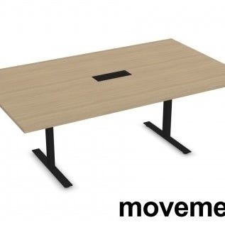 Selger et furulaminert hev og senk bord med 90 grader vinkel. Benene er i sortmalt metall. Linak hev og senk system.