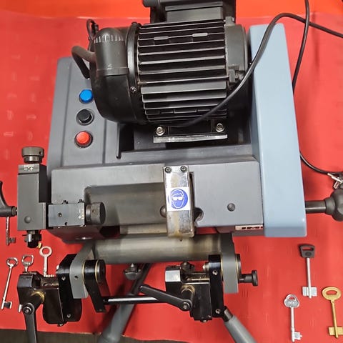 Maskin for nøkkelsliping. Følger med to stativer med forskjellige nøkkelemner. Og ikke nok med det, ønsker du et skap til maskinen følger dette med. Skapet er litt slitt.
