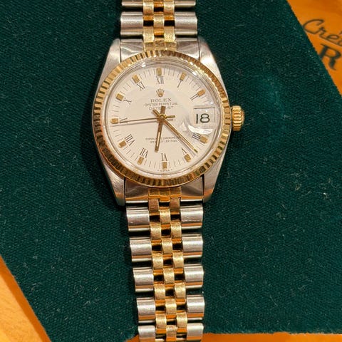 Opplev den elegante skjønnheten til Rolex Lady-Datejust 69173, en 26 mm klokke som kombinerer 18 karat gult gull og stål.