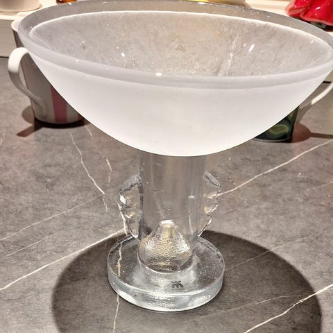Stor og vakker håndlaget skål (fuglebad) med ben som er virkelig forseggjort. Skålen er dekorert med tre fugler på kanten.