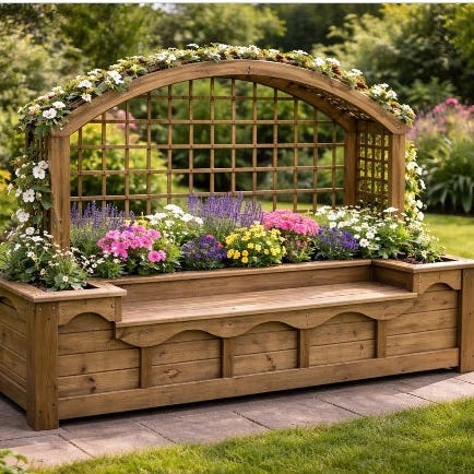 Denne blomsterkassen med espalier for hjørne er en perfekt måte å dyrke en rik blanding av planter og blomster. Den er spesielt godt egnet for klatreplanter takket være espalieret.