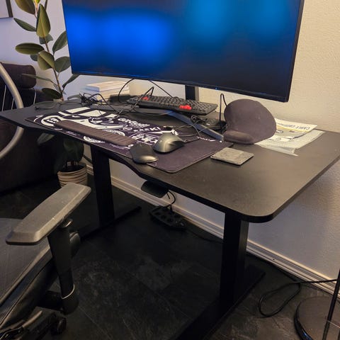 Hjørneskrivebord høyre 200x120 med elektrisk hev og senk, bøk - pent brukt selges.
