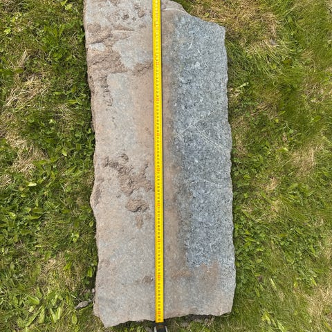 Larvikittblokka Tvedalen er mørkeblå med grove korn og skinnende blå krystaller. Saget topp, bunn og ender.