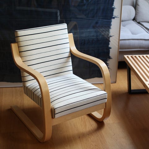 Også stol som har blitt ny. Redesign med ramme i heltre teak og tilhørende skammel. Trukket om i kvalitetsstoff. En one of a kind stol som ingen andre har.