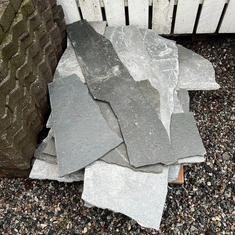 Resteparti av ca. 70m2 brasiliansk skifer til peisplater eller lignende (kun innendørs bruk, ikke frostsikkert).