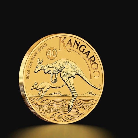 En av verdens mest populære gull-investeringsmynter, Australian Kangaroo fra Perth Mint. Mynten ligger i myntkapsel.