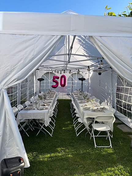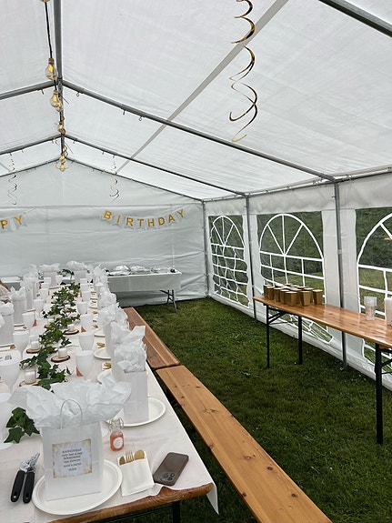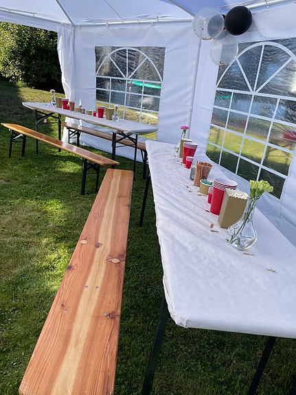 Partytelt ink. bord og benker (5komplette benkesett):