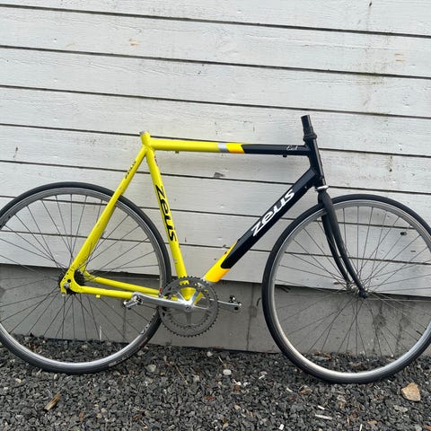 Ny Sturmey Archer krank, KMC single link kjede, Tunturi hjul, Maxxis dekk, vintage Gipiemme Cronospecial pedaler og Brooks sete.