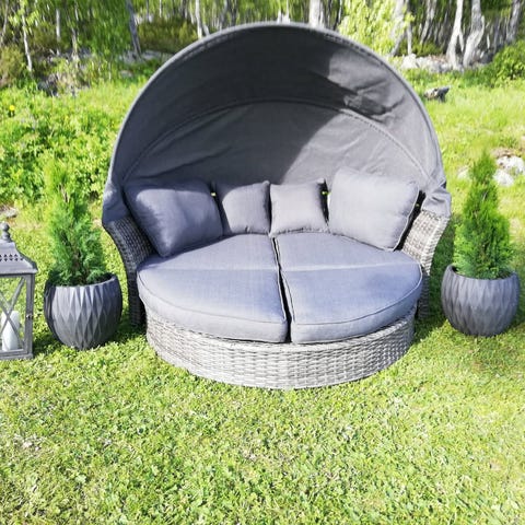 Solseilet gir deg beskyttelse mot både sol og vind, og kan enkelt foldes sammen etter behov. De 7 cm tykke sitteputene og tre myke puter har vannavvisende trekk som kan vaskes og er utstyrt med skjulte glidelåser for et stilrent utseende.