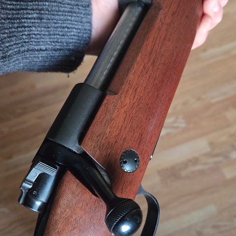 Geværet er påmontert ringer for kikkertsikte (for 26 mm rør), men låsehendelen for bakre feste er brukket.
