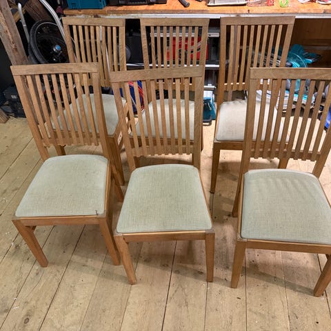 Flotte stoler i eik med seter i brunt skinn! Samlet pris; 6500,-.