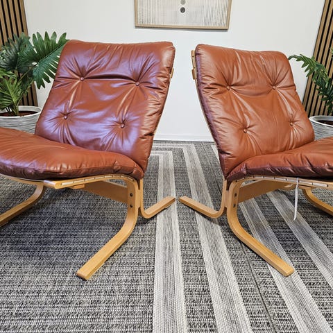 Fantastisk nydelige Siesta Classic lenestoler trukket i cognac skinn med oljet eik understell – en av de flotteste og mest tidløse kombinasjonene!