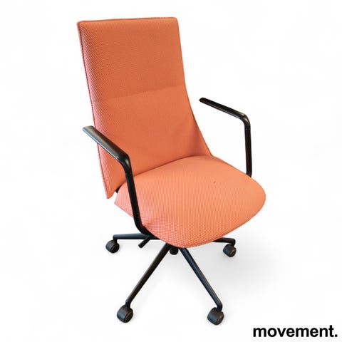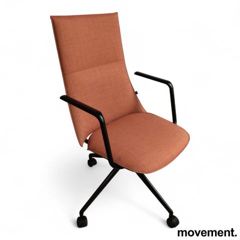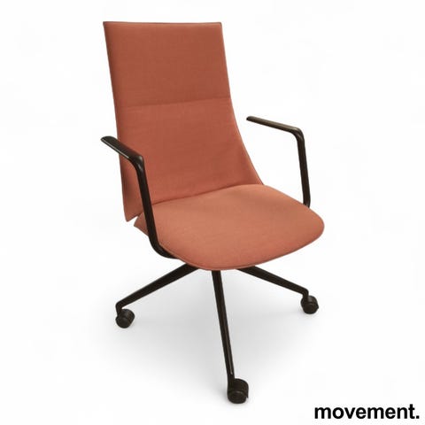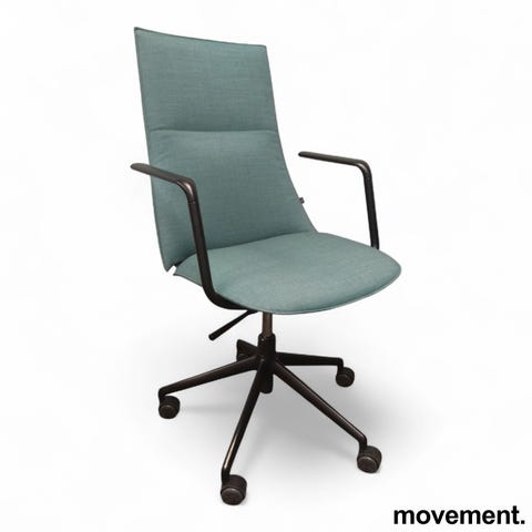 Stolen har en medium høy rygg og er trukket i mykt stoff som gir god komfort. Det stabile understellet sørger for at stolen står stødig, samtidig som hjulene gir fleksibilitet i bruk.