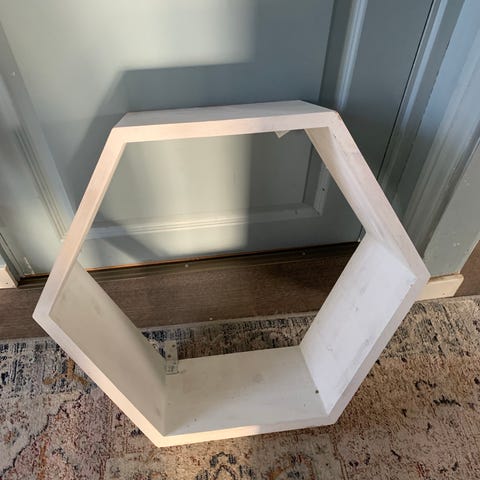 Herlig hylle - som kan henges enkelt opp eller stå på et bord etc. Den er laget i ett stykke og er i rustet metall. Høyde er 51 cm, bredde 30 cm og dybde 31 cm. Klassisk hylle som har hel metallplate i bunn av hver hylle. Produsert av Gus Design. Ny.