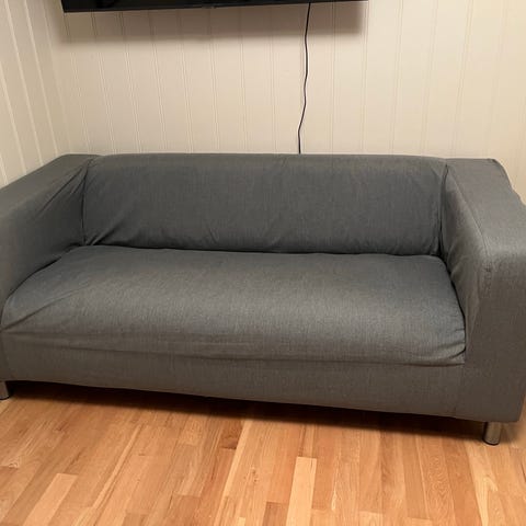 Ikea Klippan sofa 2-seters, sort skinn - pent brukt til salgs.
