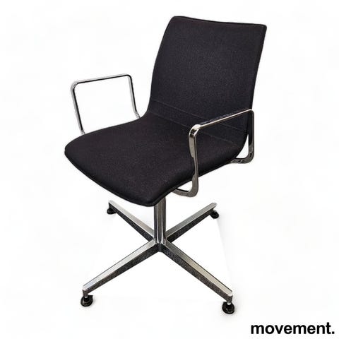 Produktbeskrivelse Moderne møteromsstol med et stilrent design, trukket i slitesterkt mørkeblått stoff. Stolen har en ergonomisk utforming som gir komfort selv under lengre møter. Den er ideell til bruk i møterom, kontorer og konferanser, og er lett å kombinere med annet møblement. Spesifikasjoner Farge: Mørkeblå Setedybde: 40 cm Høyde: 77 cm Sittehøyde: 45 cm Materiale: Stoff Tilstand Stolen er i god tilstand med normale bruksmerker, men fremstår fortsatt som solid og klar for bruk. Den gir fortsatt god komfort og er praktisk for både møter og kontorarbeid.