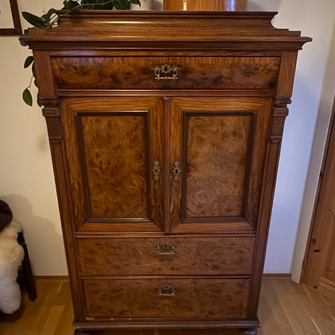 Skriveplaten kan holdes oppe med pinner som dras ut på hver side. Nyere smijernbeslag og lås. Håndtak på sidene.