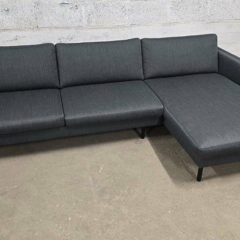 Strøken Bolia Sepia sovesofa med sjeselong. En stilig sofa med lav profil. Italiensk lounge med masse komfort. Her i en utrolig lekker finish med sort stoff og sokkel i oljet eik. Puff medfølger.