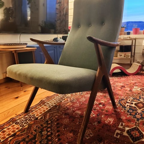 Helt restaurert Baryton lenestol fra Møre lenestol fabrikken, trukket i mykt ull stoff med lakkert teak armlenene.
