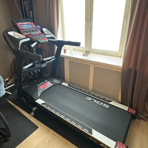 I veldig god stand - gått totalt 251 timer. Løpebånd og løpeplate byttet i forrige eie. Service og kalibrering utført. Originalt SOLE-pulsbelte medfølger.