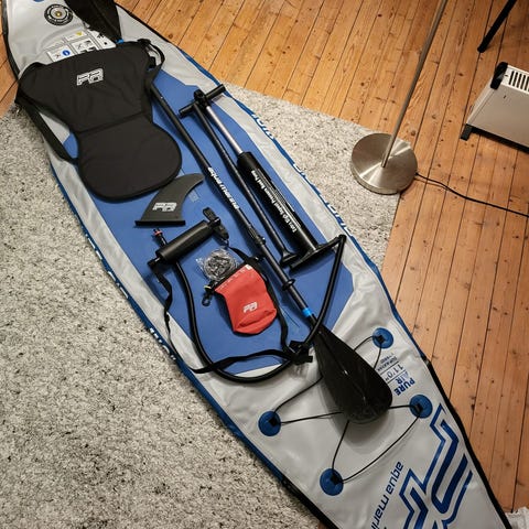 Det medfølger en veldig bra sekk, 3-delt justerbar padleåre, dobbelaktiv pumpe med trykkmåler, avtagbar hovedfinne og ankel/fot stropp.