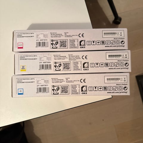 Selges samlet eller enkeltvis: 10 stk originale OKI tonerpatroner, alle helt nye og i originalemballasje. Flere ulike modeller som passer til forskjellige OKI ES-serie skrivere/MFP-modeller.
