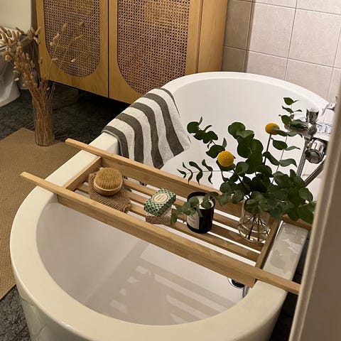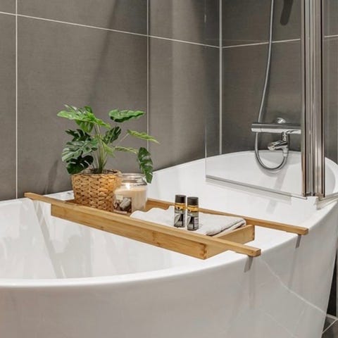 Badekarbro fra Esbada. Plasser dine dusjprodukter, lys, og andre ting du ønsker å ha med deg i badekaret. Stram og lekker i designet og kan fint henges på en krok på veggen når den ikke er i bruk.
