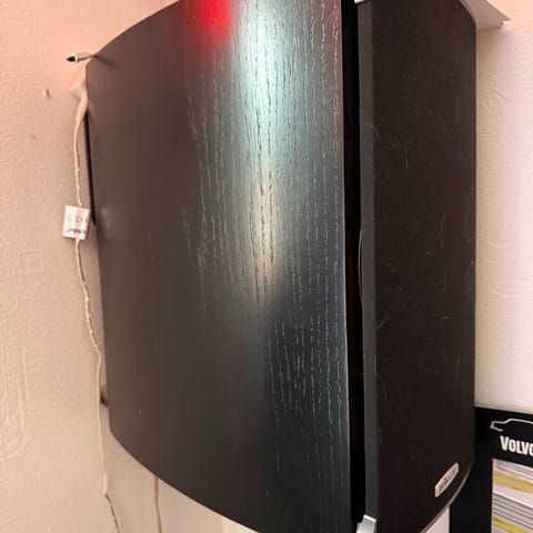 En høyttaler ligger uåpnet i original forpakning. Den andre har vært defekt, men deretter reparert og oppdatert på verksted. Ser ut som ny, med et lite bruksmerke. I fargen sort ask, og satt ned 5004,-