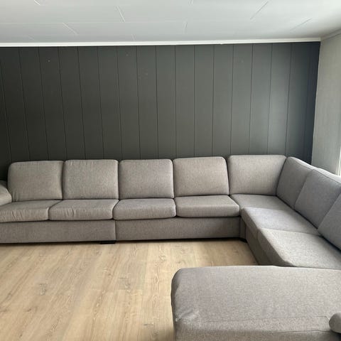 En moderne, modulær hjørneløsning der den store puffen fungerer som ekstra sone, chaiselong-forlengelse eller “mykt salongbord”. Lys grå farge som lyser opp rommet og får alt til å se ryddig ut. Tykk polstring, brede puter og rene linjer – som ny, uten nupper og flekker.