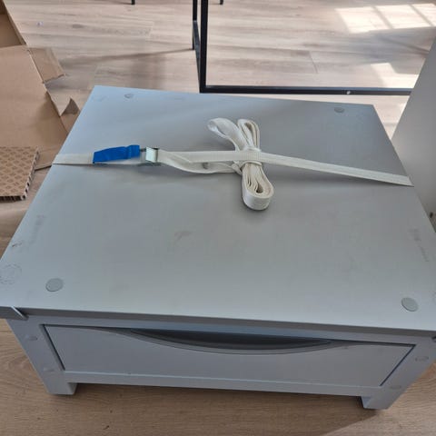 Sokkelen er laget av høykvalitets stål, og er svært solid og kan holde en vaskemaskin med en vekt på opptil 100 kg. Takket være de sklisikre putene vil vaskemaskinen stå stabilt. Sokkelen har også en praktisk uttrekkbar hylle for ekstra oppbevaringsplass.