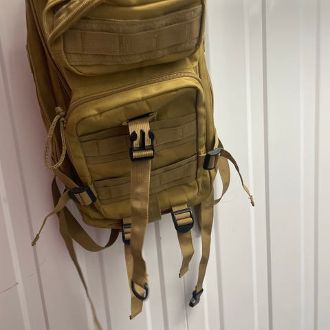 Praktiske stropper: Ryggsekken i militær stil har to brede skulderstropper og en stropp rundt midjen.