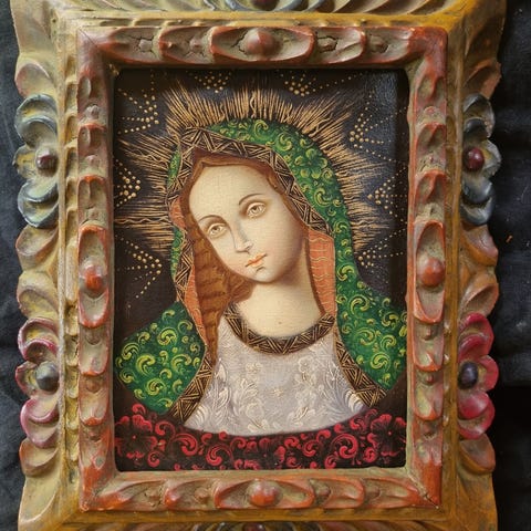 Madonnakopi. Olje eller oljetrykk. 74 cm x 96, 5 cm brutto. Treramme uten glass. Hentes i Oslo eller du får kunsten tilsendt. Madonna. Lagerplass L8.
