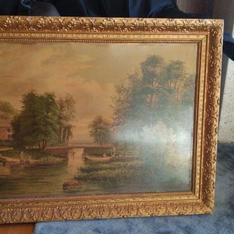 Kitchete oljemaleri med gedigen ramme som er mer verdt enn kunsten. 65 cm x 54,5 cm brutto. Hentes i Oslo eller sendes. Lagret på plass D415