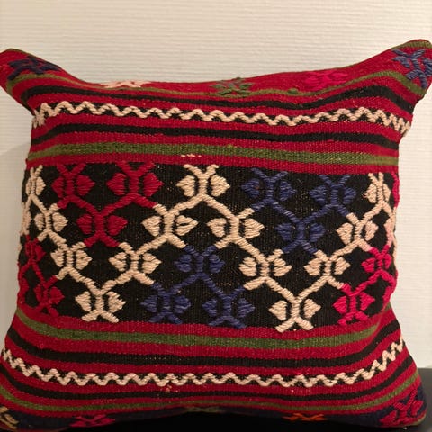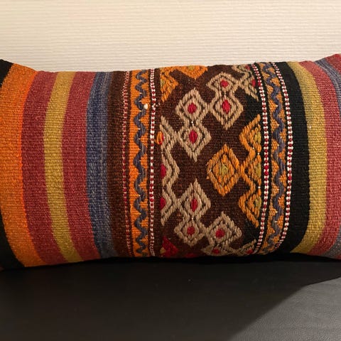 Herlig putetrekk som er vevd av franske Tissage Art de Lys. Det er vevd jacquard-stoff. Motivet er kjente Frida Kahloo. Det er ikke lett å få gjengitt på bilder, men det er vevd inn gulltråd og det glinser litt i gull i motivet. Svært dekorativt. Og en detaljerikt og flott vevd putetrekk - som alt som Art de Lys leverer.