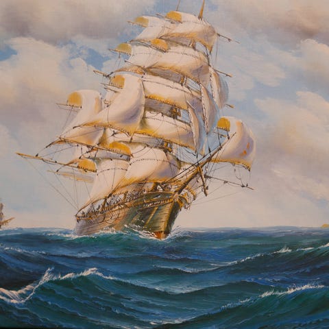 Skonnertskip Fri av Sarpsborg. Glass og ramme. Hentes i Oslo eller sendes. Lagerplass D441.