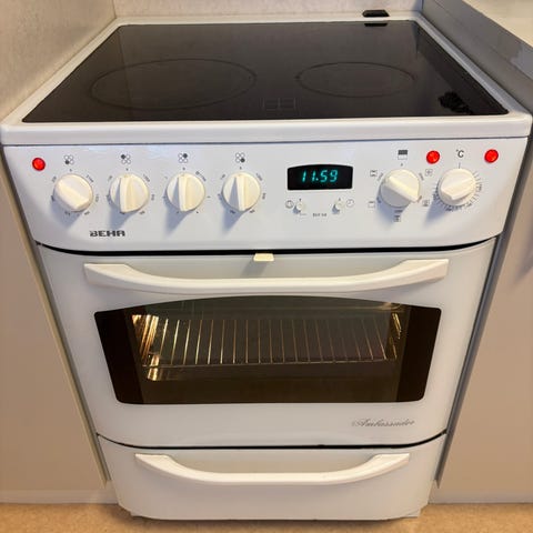 Komfyren er brukt, men i god teknisk stand. Alt fungerer som det skal. Noe normal bruksslitasje.