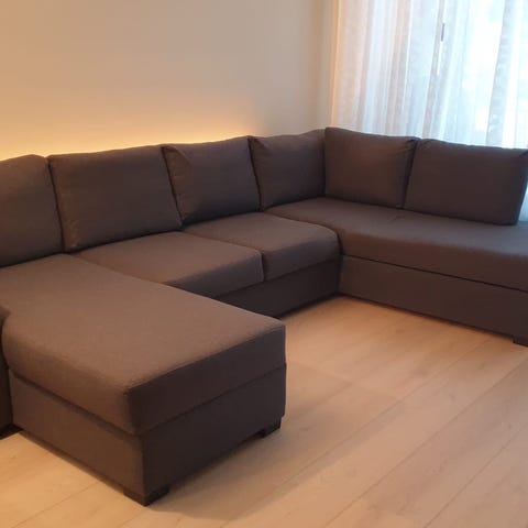 Meget praktisk U-sovesofa! Sovedelen er en skuff som lett trekkes ut og gjør sofaen til en dobbeltseng. Masse super oppbevaringsplass under sjeselongene, perfekt til ekstra puter og pledd.