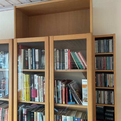 Moderne Billy Hylle og skap med glassdører fra IKEA. Fremstår pent brukt og velholdt tross enkelte bruksmerker. Et møbel som er garantert å varme opp hjemmet nå som nettene blir lange og kulda treffer inn. God lagringsplass til de fineste vinglass, middagsserviset og Hamsun-samlingen (og denslags).
