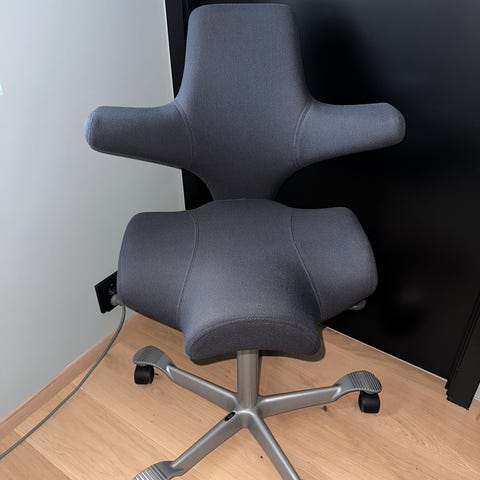 Produktbeskrivelse Denne modellen av HÅG Capisco har et unikt design som fremmer aktiv sitting. Med sitt sadelformede sete bidrar den til å forbedre blodsirkulasjonen og skape en naturlig sittingstilling, perfekt for lange arbeidstimer. Ergonomiske funksjoner Ryggstøtte: Fast ryggstøtte som gir støtte til hele ryggen Sete: Sadelformet sete som oppmuntrer til variasjon i sittestilling Armlener: Uten armlener for økt bevegelsesfrihet Justeringsmuligheter: Høydejustering av setet fra 47 cm til 70 cm Spesifikasjoner Merke/Modell: HÅG Capisco Materiale: Stoff på sete og rygg, aluminiumsramme Farge: Jordfarget brun Størrelse: Bredde 49 cm, Dybde 39 cm, Høyde 95 cm Tilstand Stolen er godt brukt med normale bruksmerker som ikke påvirker funksjonaliteten. Stoffet er i ok stand uten større skader. Alle justeringsmekanismer fungerer som de skal.