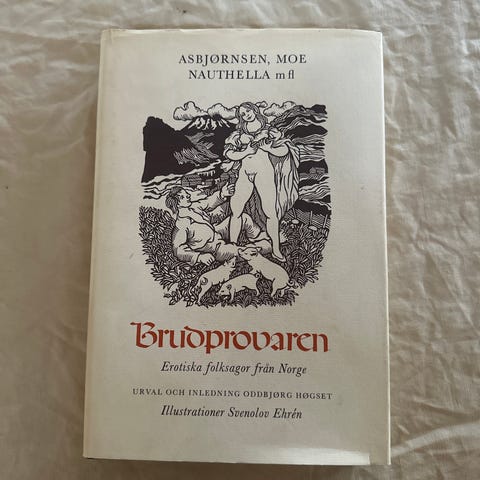 Brudprovaren. Erotiska folksagor från Norge. Asbjørnsen og Moe m.fl. Oddbjørn Høgset (redaktør) og Svenolov Ehrén (illustratør). Wahlström & Widstrand 1986. På svenska. Hentes i Oslo eller sendes.
