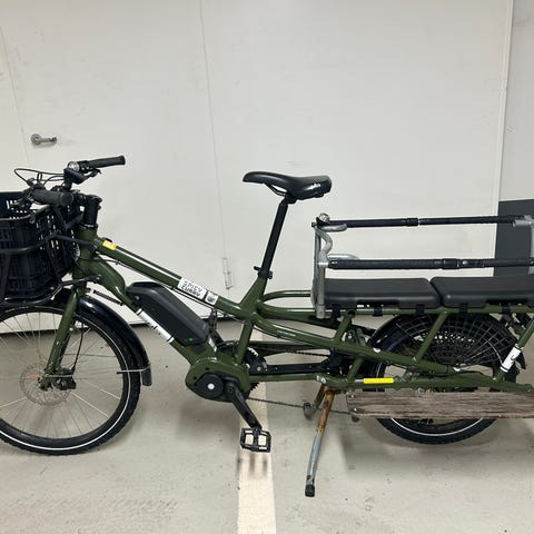 Dette er en ekstra solid lastesykkel med forsterket ramme, hjul og ekstra kraftige bremser for å gjøre selv lange norske bakker med barnevogn trygt.