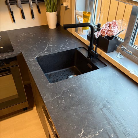 Merk at dette er en del av flere plater, derfor er det frest ut for vinkel i platen (se bilder). Det er også skjært ut for vask.