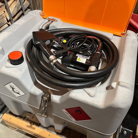 Den kan brukes til både diesel og fyringsolje. Ikke bensin. Kan flyttes med truck eller løftesstropper i hjørna.