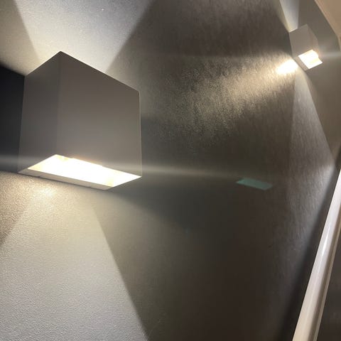 Stilig lampe med to roterende spotlights, inkluderer også en praktisk dimmerbryter