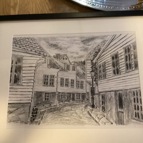 Visby. Parti ved Norra Muren. S Palmquist 1948. Tegning. 46 cm x 38 cm. Glass og ramme. Hentes i Oslo eller sendes.