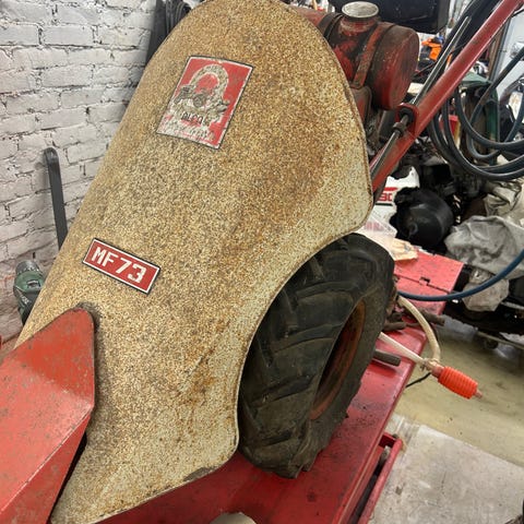 Eldre, sidestilt slåmaskin med to tromler. Ca. 2 meters klippebredde.